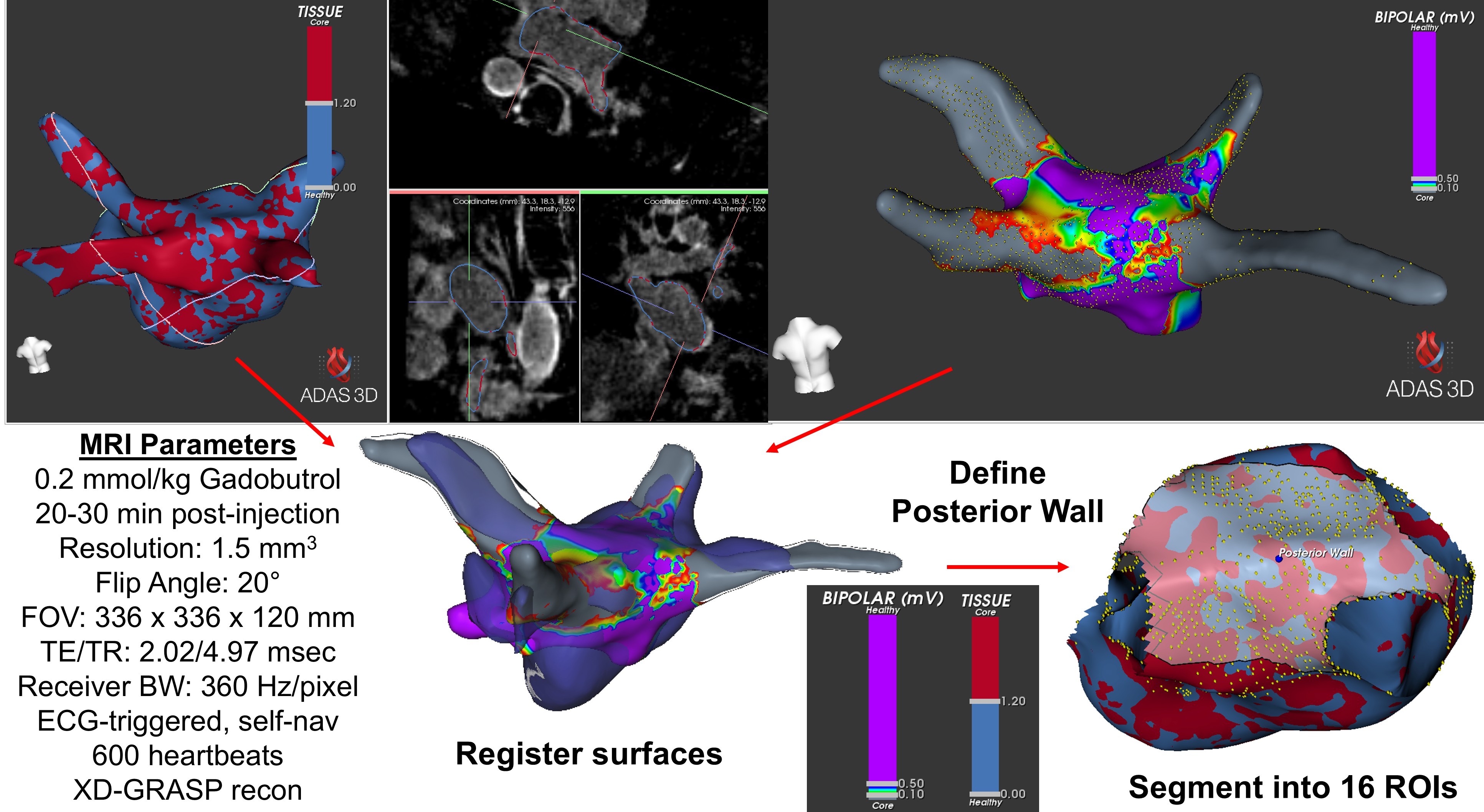 Point-by-point and segmental IIR-bipolar voltage correlation approaches. TOP: Scatter plots of all posterior wall IIR-EAM pairs (left) and nonzero IIR-EAM segments (right). BOTTOM: Natural log-transformed bipolar voltage boxplot ranges sorted by Image Intensity Ratio. IIR < 1.2 is considered “healthy”, IIR 1.2-1.45 is considered “scarred”, and IIR > 1.45 “densely scarred”, using published language from Benito et al (5).
