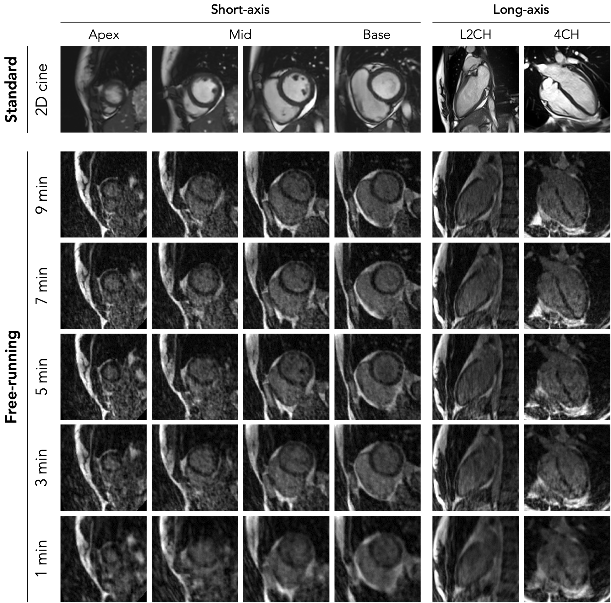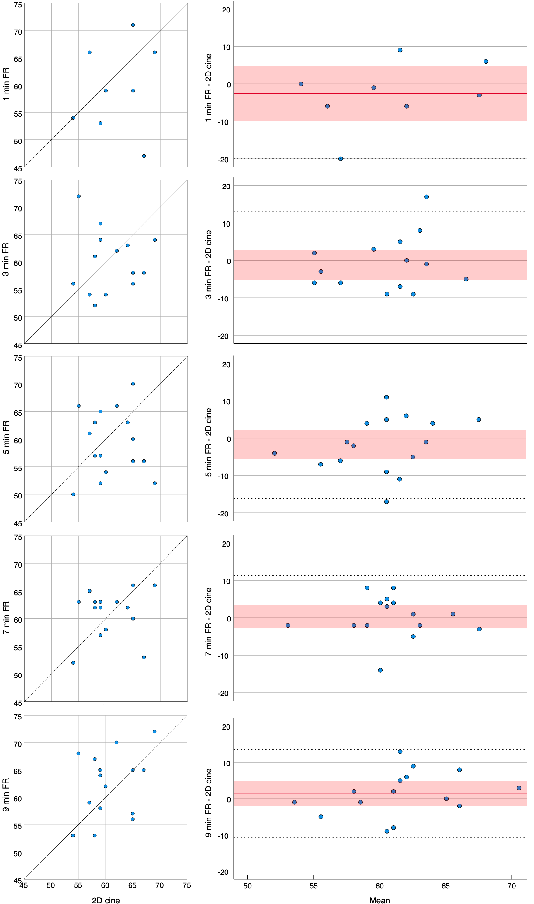 Correlation plots and Bland–Altman analysis of the left-ventricular ejection fractions (in %) as derived from 5D free-running imaging using various durations (1, 3, 5, 7 and 9 min) at 0.55T compared to reference standard 2D breath-hold cine imaging at 1.5T. The solid red line and red shaded area in each Bland–Altman plot indicate the bias with its 95% confidence interval, while the black dotted lines indicate the limits of agreement. All axes indicate absolute percentages..png)