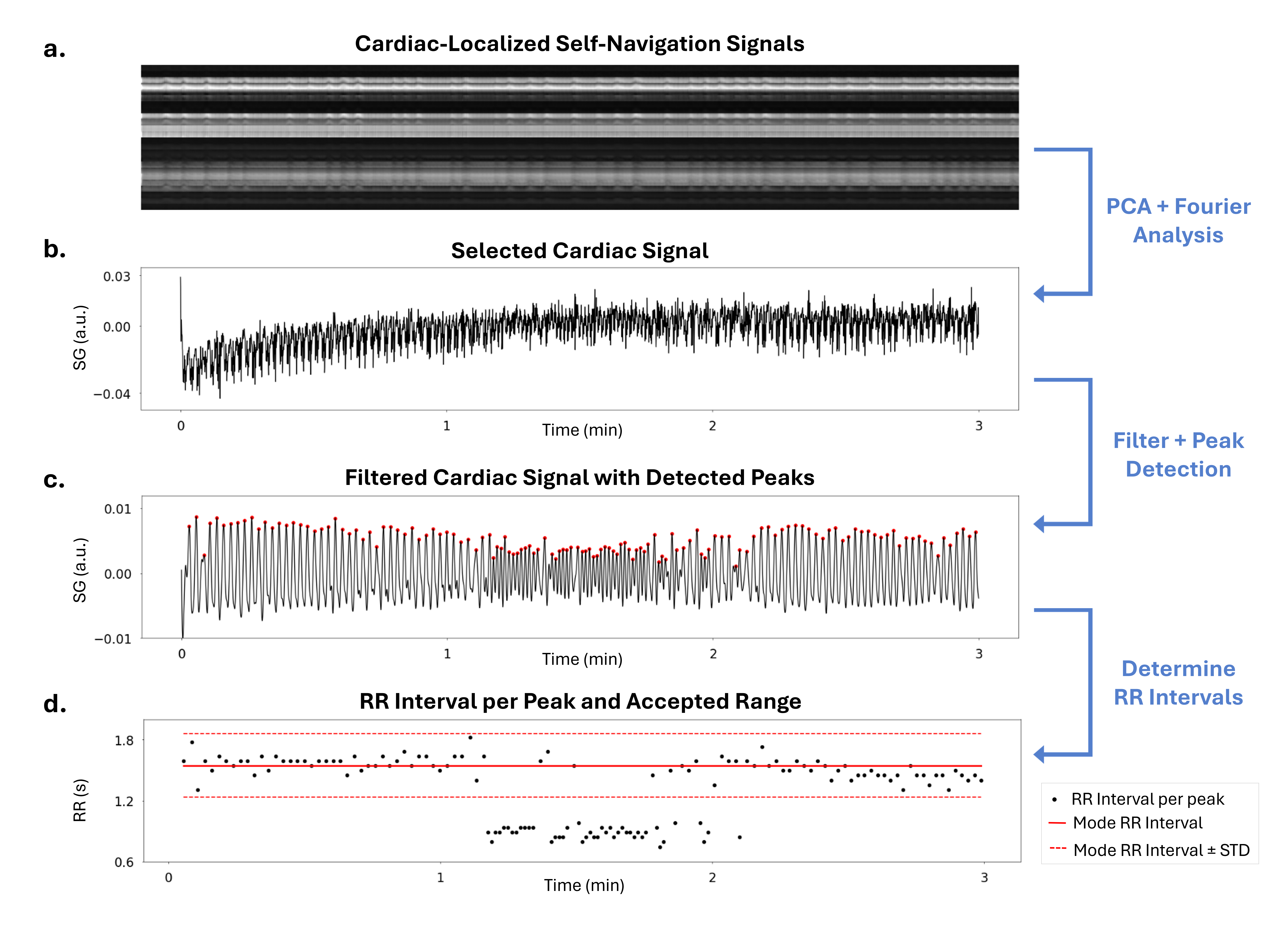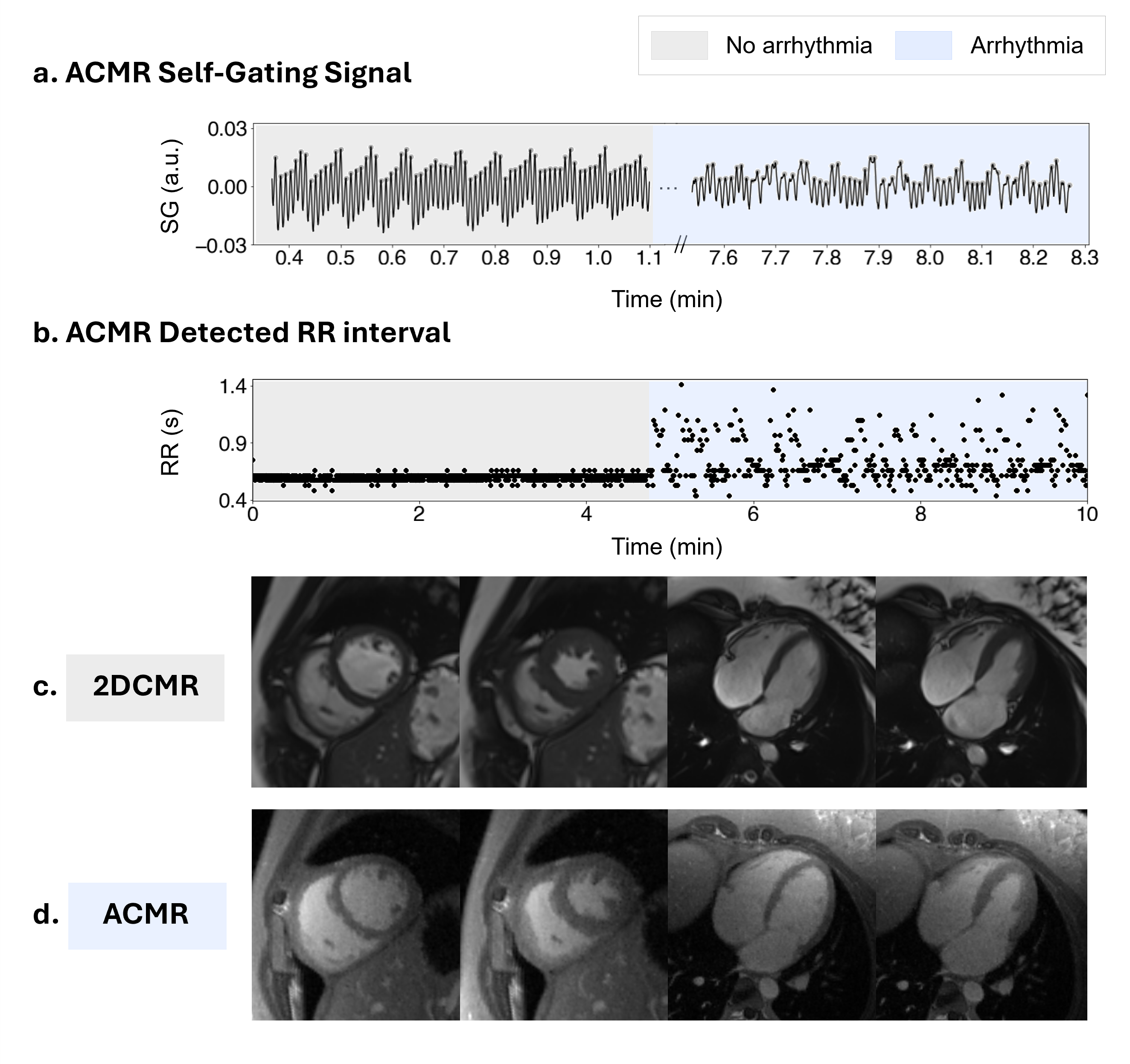 Figure 3. Patient 4 was observed with ECG monitoring to be in normal rhythm during the 2DCMR acquisition and the first 5 minutes of the 10-minute AutoCMR cine acquisition (gray), and to have frequent arrhythmia during the remaining 5 minutes (blue). The beginning of frequent arrhythmia was similarly observed 5 minutes into the AutoCMR exam on both the self-gating signal (a) and the detected RR-interval (b). With automatic rejection of data acquired during irregular heartbeats, the resulting AutoCMR images (d) are comparable to 2DCMR images acquired in normal rhythm. .png)