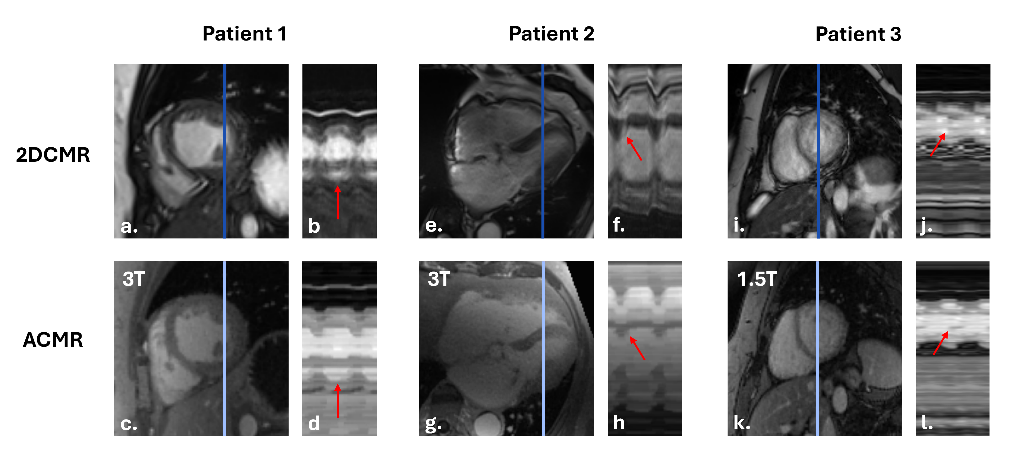 Figure 2. In three example patients with arrhythmia during scanning, 2DCMR images (a, e, i) are observed to have resulting motion blurring artifacts, while AutoCMR (ACMR) images (c, g, k) are artifact free with well-defined cardiac motion. Motion plots, generated by plotting a projection through the LV (blue) over time, show spatial and temporal blurring (red arrows) in 2DCMR images (b, f, j) compared to AutoCMR (d, h, k).