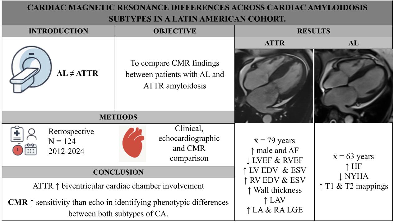 LVEF: left ventricular ejection fraction; LV EDV: left ventricular end-diastolic volume; LV ESV: left ventricular end-systolic volume; LV SV: left ventricular stroke volume; RV EF: right ventricular ejection fraction; RV EDV: right ventricular end-diastolic volume; RV ESV: right ventricular end-systolic volume; LA: left atrial LGE: late gadolinium enhancement; ECV: extracellular volume fraction.Clinical and echocardiographic characteristics of patients with ATTR and AL cardiac amyloidosis.
