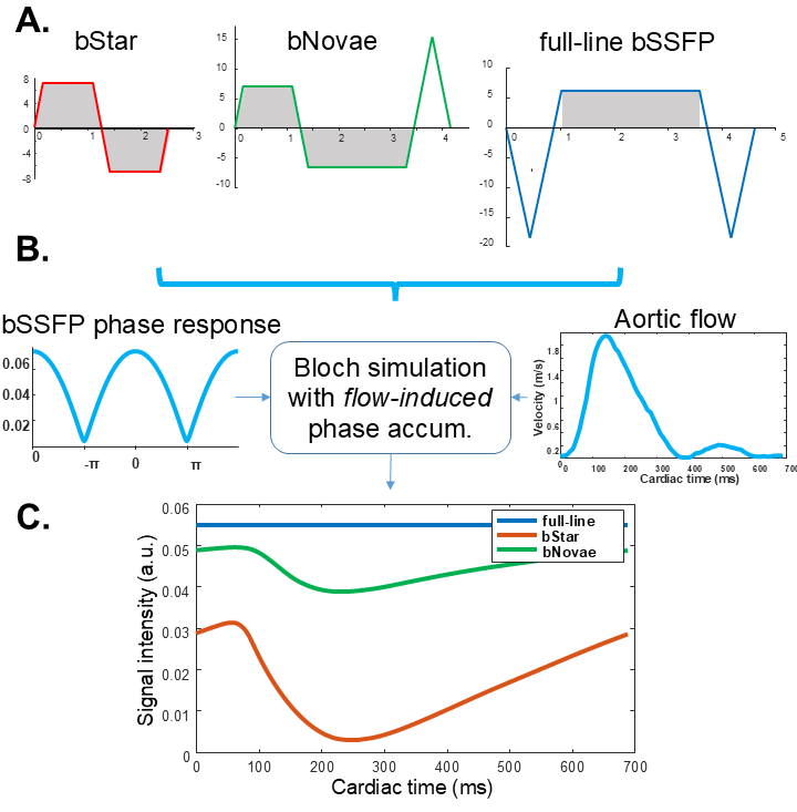 Free-running sequence modules (A), with ADC sampling in gray, were included in a numerical simulation (B) to confirm bStar high flow sensitivity (C). By extending the 2nd echo, in proposed bNovae, flow-induced signal loss was greatly reduced while maintaining an ultra-short echo time and a high sampling duty cycle.