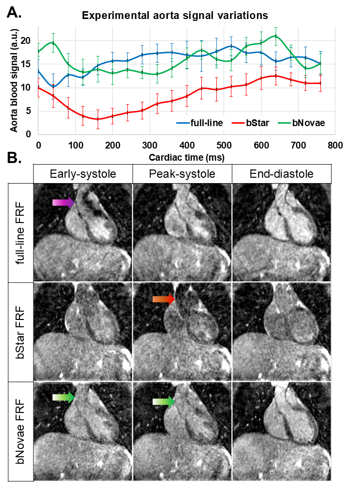 A: Measurements of free-running (FRF) signal variations in the aortic root confirmed bStar signal loss, as anticipated by numerical simulations. B: Coronal views of key frames within the cardiac cycle showed severe signal loss in the aortic root: from intravoxel dephasing in full-line FRF (purple arrow) and from flow-induced accumulated phase in bStar FRF (red arrow). Thanks to increased sampling efficiency, bStar and bNovae images were also sharper than full-line images that suffered from a global mild blur.