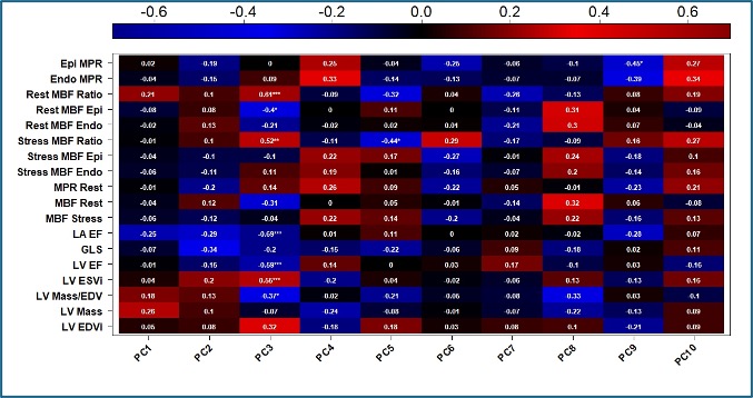 Figure 2: Eigencor plot showing the correlation between principal components (1-10) on the x axis and cardiac MRI parameters from patients’ follow up study visit on the y axis. Colours indicate the strength and direction of the correlation, with red representing positive correlations and blue representing negative correlations. The scaled bar on the right represents correlation coefficients, and significance levels are denoted by asterisks (*p < 0.05, **p < 0.01, ***p < 0.001). PC, principal component; LVEDVi, indexed left ventricular end diastolic volume; LV Mass EDV, left ventricular mass to end diastolic volume ratio; LVESVi, left ventricular end systolic volume indexed; LVEF, left ventricular ejection fraction; GLS, global longitudinal strain; Atrial EF, atrial ejection fraction; MBF Stress, stress myocardial blood flow; MBF Rest, rest myocardial blood flow; MPR rest global, global myocardial perfusion reserve; Stress MBF Endo, endocardial stress myocardial blood flow; Stress MBF Epi, epicardial stress myocardial blood flow; Stress MBF Ratio, stress myocardial blood flow ratio; Rest MBF Endo, endocardial rest myocardial blood flow; Rest MBF epi, epicardial rest myocardial blood flow; Rest MBF ratio, rest myocardial blood flow ratio; Endo MPR, endocardial myocardial perfusion reserve; Epi MPR, epicardial myocardial perfusion reserve.