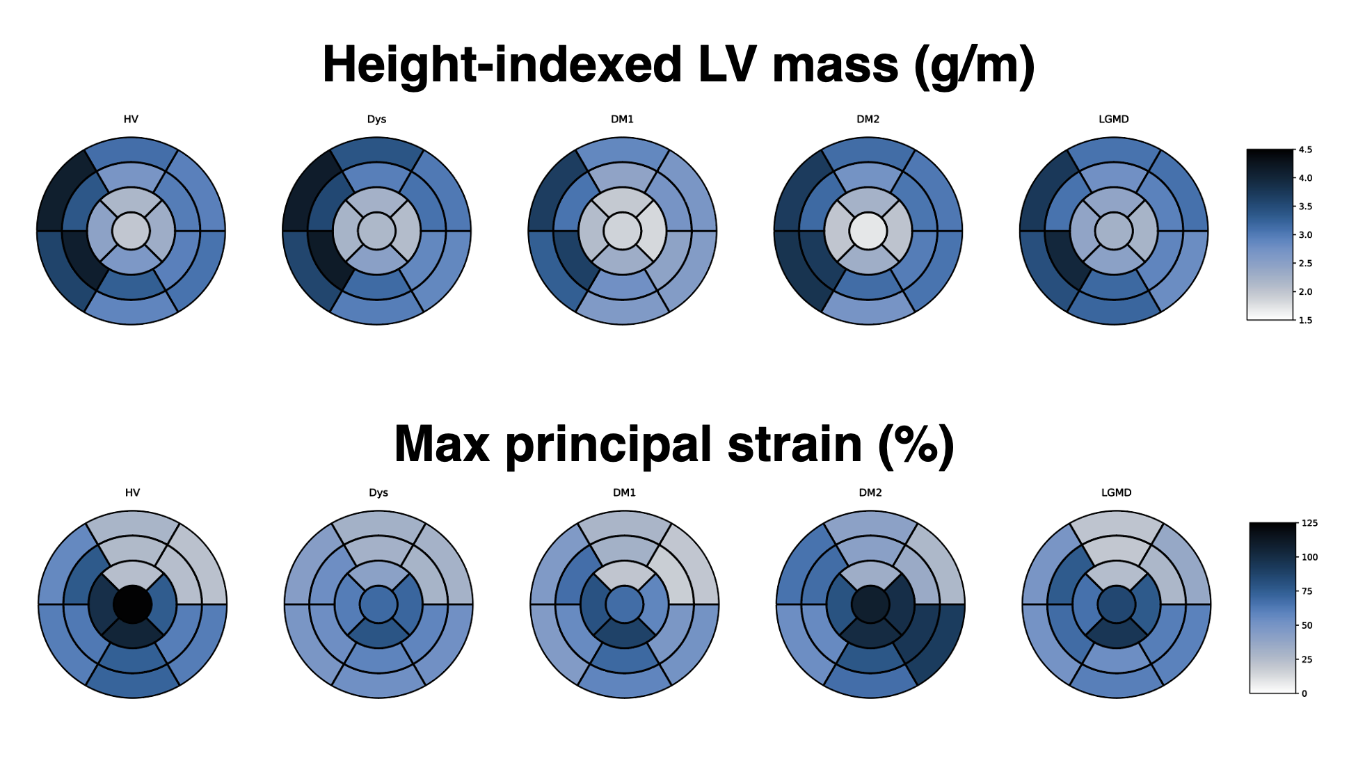 Characteristic HVN = 100 Dystrophinopathies N = 41 DM1 N = 42 DM2 N = 17 LGMD N = 20 p-value Age, y 46.0 (30.0, 54.0) 27.0 (20.0, 36.0) 40.5 (31.0, 55.0) 52.0 (42.0, 60.0) 50.0 (31.5, 56.5) < 0.001 Male sex 46 (46%) 41 (100%) 18 (43%) 7 (41%) 13 (65%) < 0.001 Conventional CMR measures LV EDV Indexed to Height, mL/m 88.1 (78.0, 99.7) 96.6 (72.4, 111.8) 77.9 (70.2, 93.6) 69.2 (59.5, 100.0) 82.1 (65.5, 104.4) 0.075 LV ESV Indexed to Height, mL/m 31.4 (26.6, 38.2) 47.6 (32.6, 58.0) 33.1 (25.6, 39.0) 27.0 (24.4, 45.0) 35.0 (26.4, 51.5) 0.001 LV EF, % 63.0 (61.0, 67.0) 54.0 (46.5, 58.9) 58.8 (53.8, 63.7) 59.0 (57.4, 62.1) 56.4 (51.0, 61.4) < 0.001 LV Mass Indexed to Height, g/m 50.8 (42.5, 62.9) 55.5 (48.4, 60.9) 44.8 (37.6, 56.5) 46.5 (38.7, 62.0) 54.5 (40.3, 65.7) 0.10 RV EDV Indexed to Height, mL/m 96.9 (85.6, 108.8) 84.7 (60.0, 93.2) 82.2 (67.5, 92.6) 73.9 (65.6, 106.7) 80.1 (63.9, 99.3) < 0.001 RV ESV Indexed to Height, mL/m 41.6 (33.6, 49.3) 39.3 (25.8, 43.9) 34.4 (28.1, 42.8) 31.5 (25.1, 53.9) 38.9 (29.4, 45.8) 0.042 RV EF 57.0 (53.5, 62.0) 54.1 (52.2, 59.4) 56.0 (52.2, 59.6) 56.4 (52.5, 61.5) 55.3 (49.1, 58.8) 0.23 LA Volume Indexed to Height, mL/m 38.6 (32.7, 46.8) 31.2 (21.3, 40.5) 30.1 (21.7, 35.6) 35.4 (25.2, 40.0) 38.2 (33.9, 48.2) < 0.001 LGE imaging Any LGE Pattern - 31 (76%) 12 (29%) 6 (35%) 10 (50%) < 0.001 Sub-Endocardial - 3 (8%) 0 (0%) 0 (0%) 0 (0%) 0.15 Mid-wall Striae - 9 (23%) 2 (5%) 1 (7%) 3 (15%) 0.092 RV Insertion Site - 3 (8%) 6 (14%) 3 (21%) 3 (15%) 0.50 Mid-wall Patchy - 15 (38%) 3 (7%) 2 (14%) 2 (10%) 0.003 Sub-Epicardial - 25 (63%) 2 (5%) 2 (14%) 6 (30%) < 0.001 Diffuse LGE - 0 (0%) 1 (2%) 0 (0%) 0 (0%) >0.99 Fibrosis/scar % - 7.4 (0.0, 16.2) 0.0 (0.0, 0.0) 0.0 (0.0, 1.5) 0.0 (0.0, 7.4) < 0.001 4Deep CMR Measures LV EDV Indexed to Height, mL/m 108.6 (91.3, 125.8) 127.8 (84.8, 145.3) 101.2 (79.3, 124.4) 85.6 (75.0, 95.1) 103.0 (91.1, 132.8) 0.050 LV ESV Indexed to Height, mL/m 45.6 (35.6, 53.0) 57.8 (40.9, 77.6) 47.7 (34.9, 61.2) 33.3 (29.8, 41.4) 58.8 (36.0, 80.9) 0.003 LV EF, % 59.6 (55.9, 62.6) 50.2 (41.3, 56.3) 53.8 (49.7, 58.9) 57.3 (52.8, 60.2) 49.9 (41.0, 61.4) < 0.001 LV mass Indexed to Height, g/m 49.8 (43.4, 61.1) 51.5 (46.7, 58.4) 44.4 (38.4, 53.5) 47.7 (37.8, 58.1) 51.7 (42.9, 62.1) 0.059 Maximum Wall Thickness, mm 11.0 (9.8, 13.1) 11.8 (9.4, 12.4) 10.7 (10.0, 12.7) 11.4 (9.7, 12.9) 11.9 (9.9, 14.2) 0.93 Mean Maximum Principal Strain, % 67.2 (59.2, 78.4) 54.3 (44.6, 70.1) 53.9 (45.4, 65.7) 71.6 (63.3, 80.5) 64.9 (41.9, 79.9) < 0.001 Mean Minimum Principal Strain, % -22.8 (-24.6, -20.6) -21.0 (-22.5, -17.6) -20.9 (-25.0, -18.9) -21.9 (-23.0, -21.3) -22.4 (-24.2, -20.1) 0.005