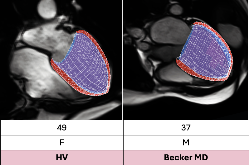 Figure 2. End-diastolic meshes from a representative HV (left panel; 49 Y female) and a patient with Becker muscular dystrophy (right panel; 37 Y male). The patient shows significant left ventricular dilatation, globular shape, and marked reduction in 4Deep LV ejection fraction (21%).
