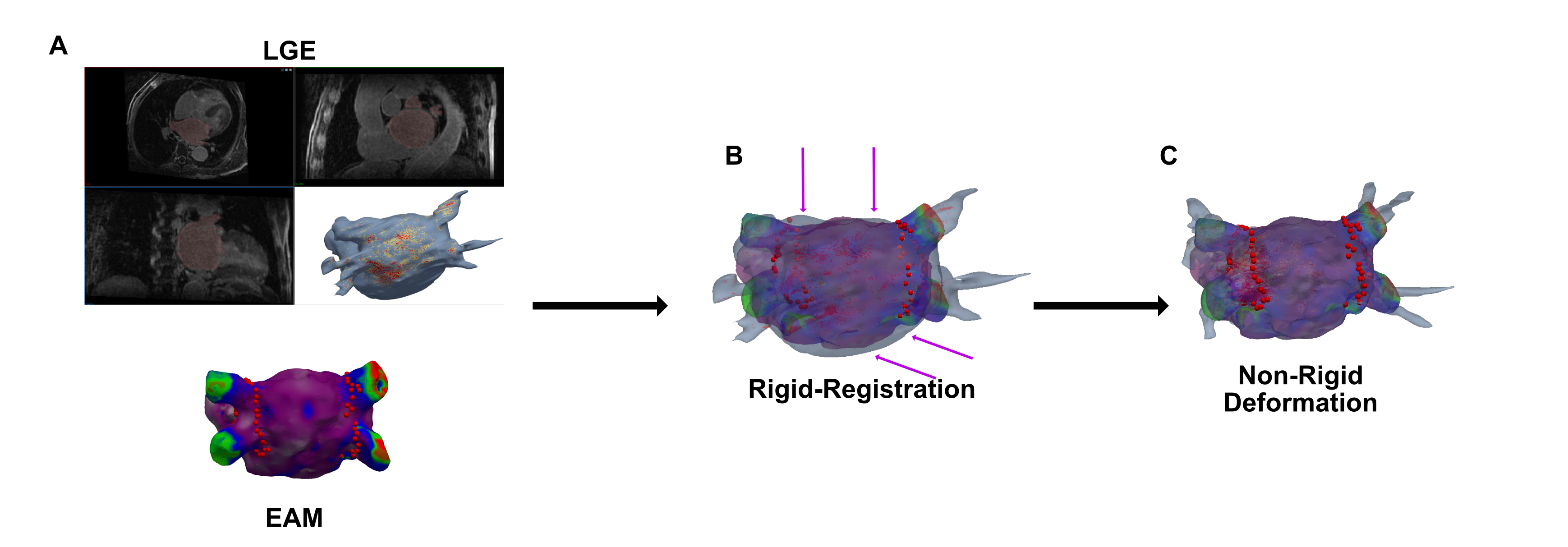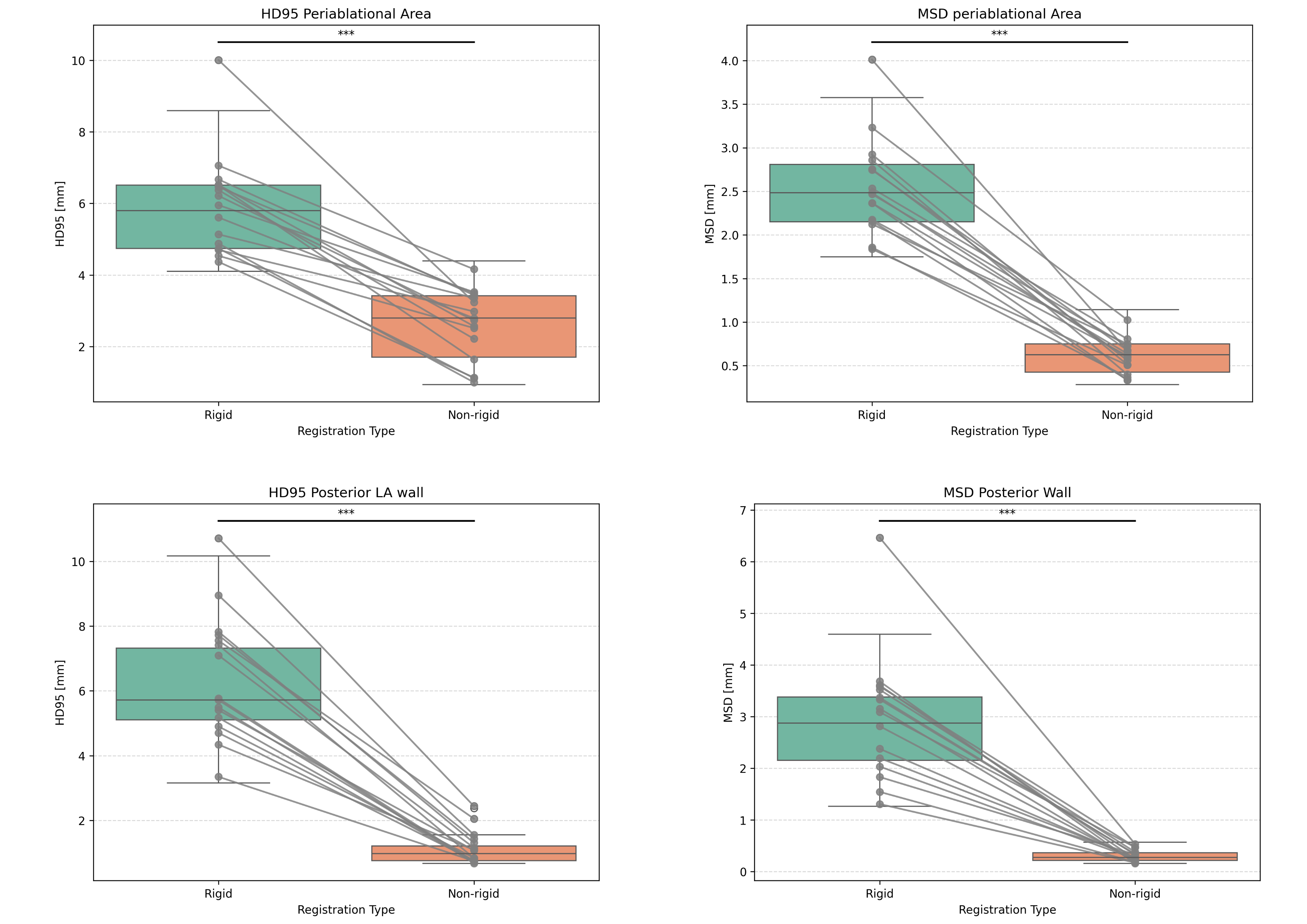 Figure 2: Symmetric 95% Hausdorff Distance (HD95) and Mean Surface Distance (MSD) for the rigid and non-rigid surface registration steps of the pipeline. The non-rigid surface deformation led to a significant reduction in HD95 and MSD in both the periablational area and the posterior left atrial wall when compared to global rigid registration alone (all p<0.001 indicated by ***). Boxplots represent median (solid line inside the box), interquartile range (IQR, box) and Q1 - 1.5*IQR or Q3 + 1.5*IQR (whiskers).