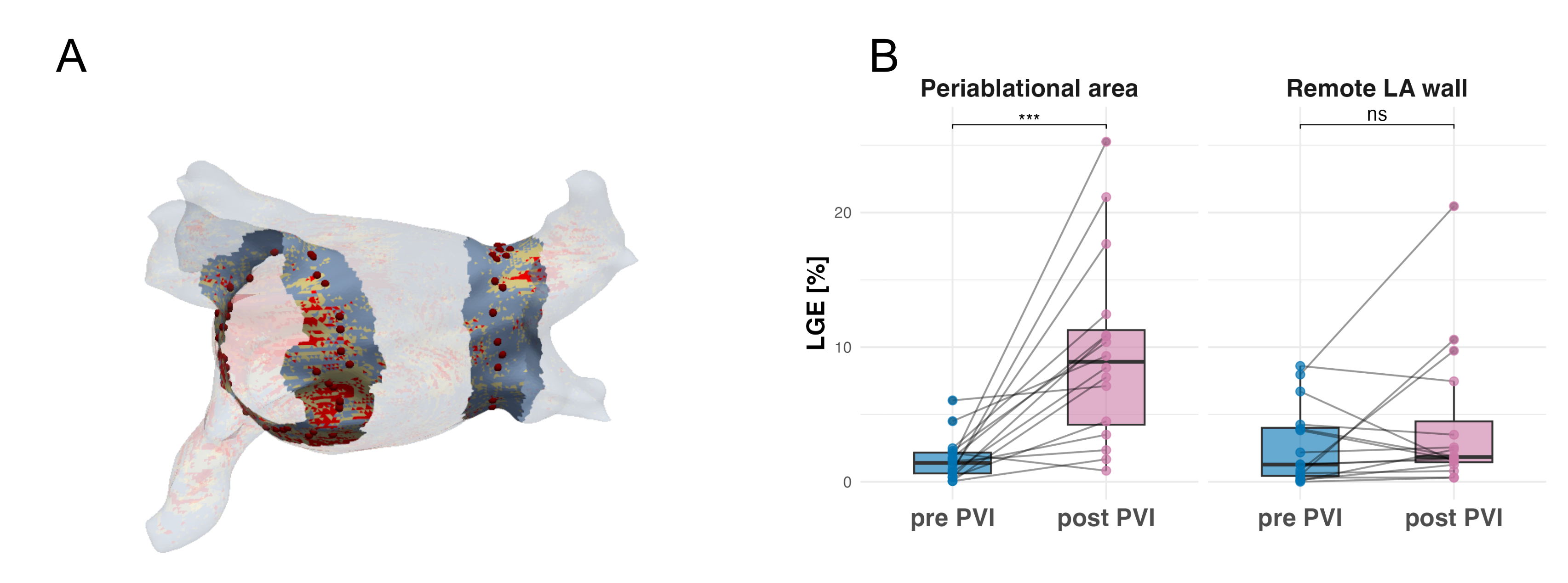 Figure 3: Clinical application of the pipeline: (A) Spatial correlation of ablation sites (dark red points) from electroanatomic mapping (EAM) with isotropic Late Gadolinium Enhancement (LGE) for regionalized quantitative assessment of ablation-induced fibrosis (periablational area displayed solid, remote left atrial (LA) wall displayed opaque, image intensity ratios >1.34 marked in red, image intensity ratios >1.2 marked in yellow). Note that for quantification of scar amount in the remote (non-ablated) LA wall, pulmonary veins, LA appendage and mitral valve were excluded from the quantification. (B) At 6 months post pulmonary vein isolation (PVI) an increase in fibrotic substrate amount was observed predominantly in the periablational area. No significant change (p=0.375 Wilcoxon signed-rank test) was observed in the remote LA wall. Boxplots represent median (solid line inside the box), interquartile range (IQR, box) and Q1 - 1.5*IQR or Q3 + 1.5*IQR (whiskers).