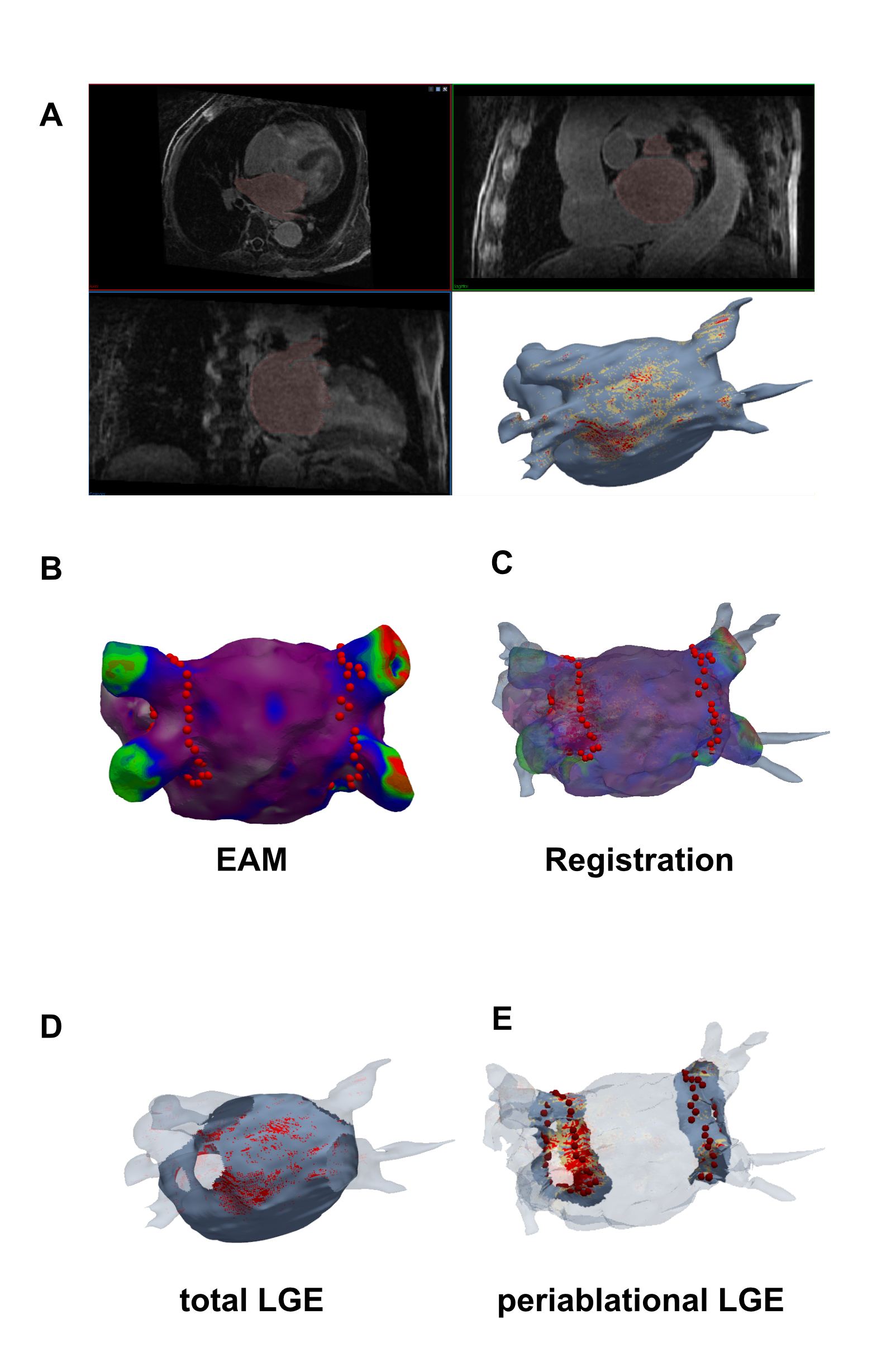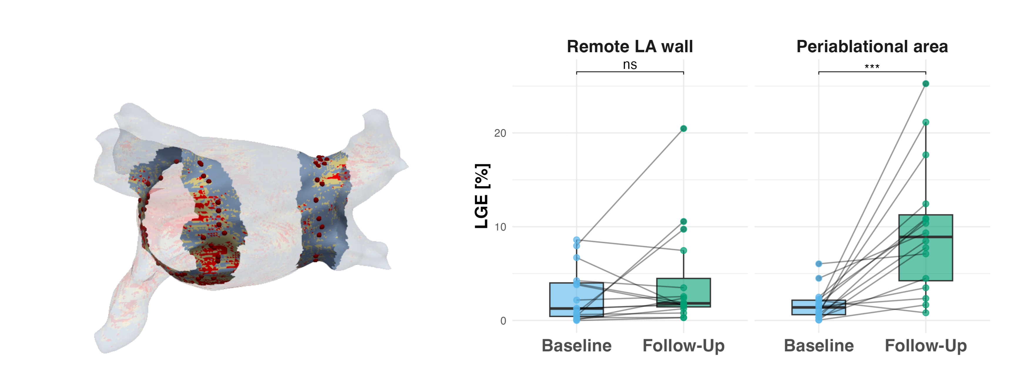 Figure 3: Spatial correlation of ablation sites from electroanatomic mapping (EAM) with isotropic Late Gadolinium Enhancement (LGE) enables quantitative assessment of ablation-induced fibrosis. EAM ablation sites spatially correlated with the LGE reconstruction can be seen in the left half of the plot. Red dots indicate ablation sites, image intensity ratios >1.34 marked in red, image intensity ratios >1.2 marked in yellow. Note that for quantification of scar amount in the remote (non-ablated) LA wall, pulmonary veins, LA appendage and mitral valve were excluded from the quantification. The right side shows the quantitative LGE analysis in the peri-ablational area and the remote LA wall. At 6 months post-PVI, changes in fibrotic substrate were observed predominantly in the peri-ablational area (right, p<0.001, Wilcoxon signed-rank test), with no significant changes in the remote LA wall (left, p=0.375, Wilcoxon signed-rank test). Boxplots represent median (solid line inside the box), interquartile range (IQR, box) and Q1 - 1.5*IQR or Q3 + 1.5*IQR (whiskers) of the left atrial LGE amount in the non-ablated remote LA-Wall (left) and periablational area (right)..png)