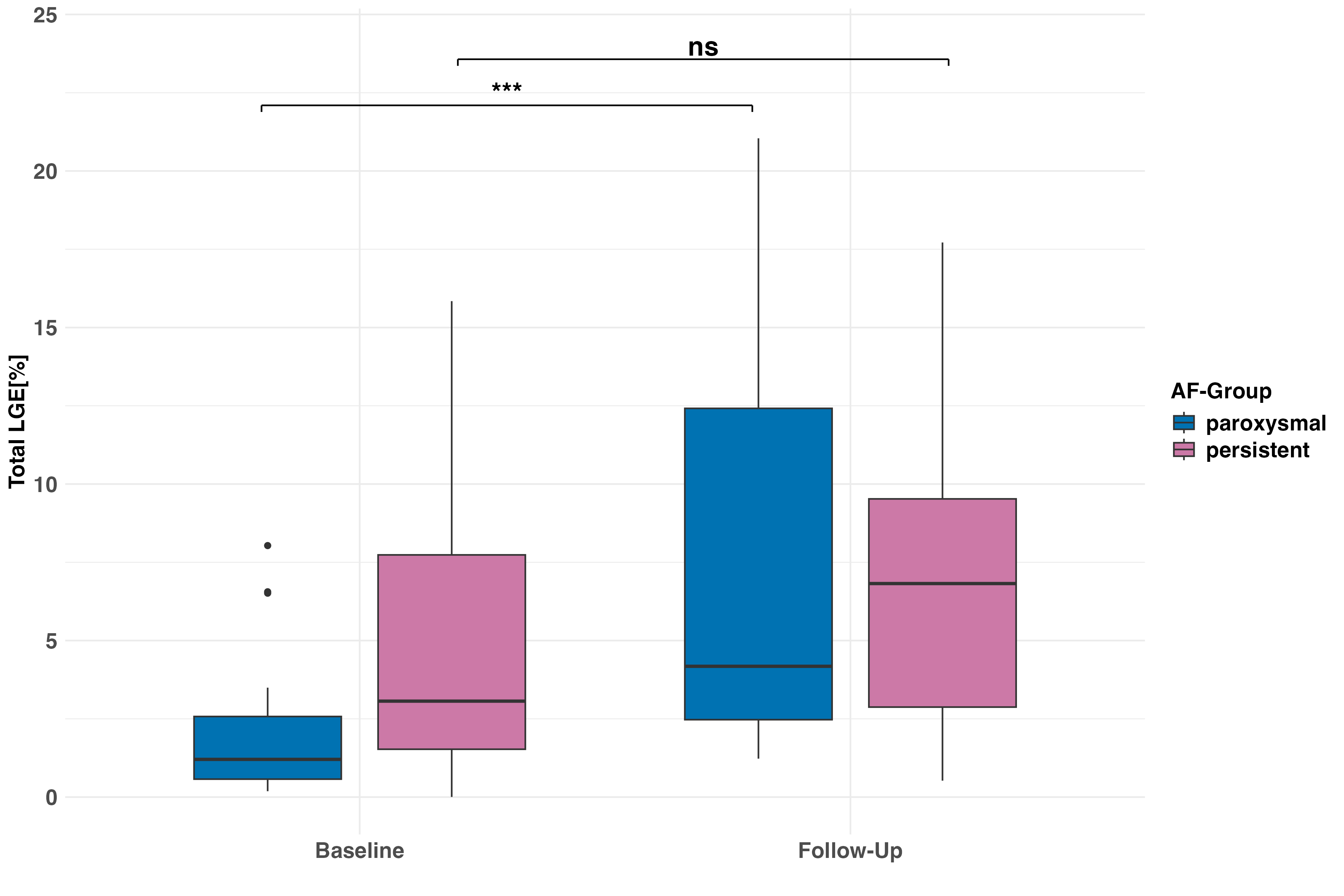 Figure 2: Total LGE in paroxysmal and persistent AF at Baseline and 6 months after PVI. At baseline, isotropic 3D LGE Dixon imaging enabled differentiation between patients with persistent and paroxysmal atrial fibrillation based on total fibrotic substrate burden. Six months after the PVI procedure, an increase in total LGE percentage was observed in both groups (paroxysmal p<0.001, persistent: p=0.24, Wilcoxon signed rank test). Boxplots represent median (solid line inside the box), interquartile range (IQR, box) and Q1 - 1.5*IQR or Q3 + 1.5*IQR (whiskers) of the total left atrial LGE amount.
