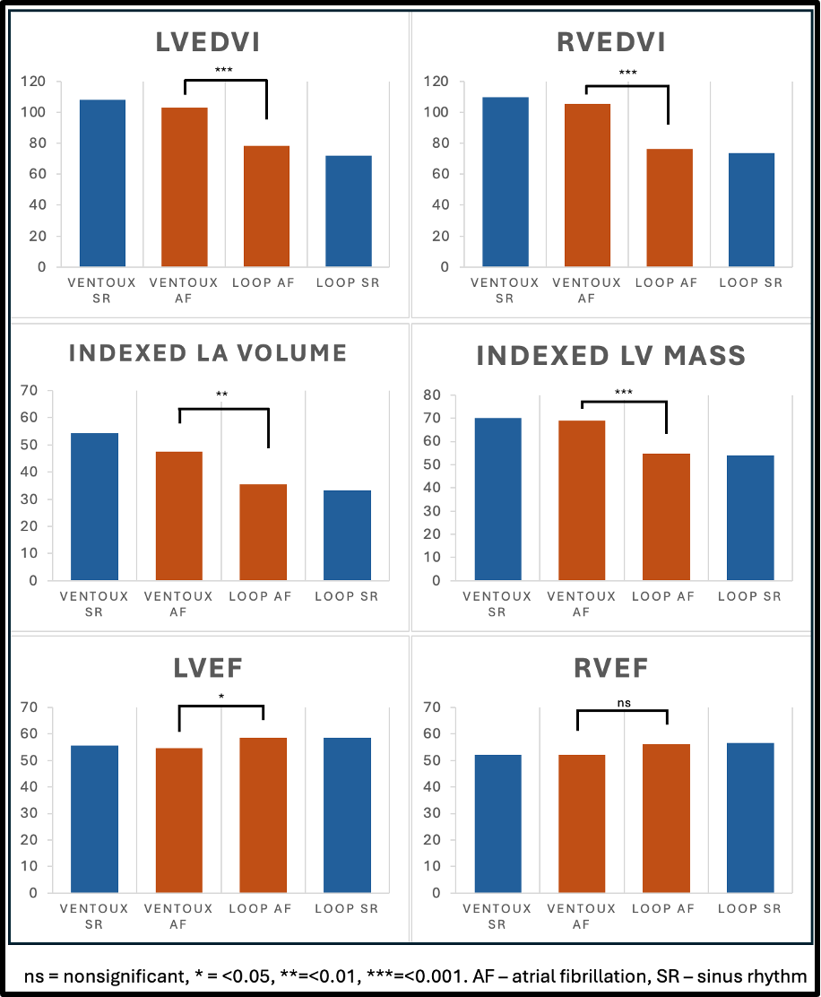Abbreviations: BMI – body mass index, BP – blood pressure, LAEF – left atrial emptying fraction, LAV – left atrial volume, LAVi max – indexed maximum left atrial volume, LAVi min – indexed minimum left atrial volume, LV – left ventricle, LVEDV – left ventricular end diastolic volume, LVEDVi – indexed left ventricular end diastolic volume, LVEF – left ventricular ejection fraction, LVESV – left ventricular end systolic volume, LVESVi – indexed left ventricular end systolic volume, LVSV – left ventricular stroke volume, LVSVi – indexed left ventricular stroke volume, RV – right ventricle, RVEDV – right ventricular end diastolic volume, RVEDVi – indexed right ventricular end diastolic volume, RVEF – right ventricular ejection fraction, RVESV – right ventricular end systolic volume, RVESVi – indexed left ventricular end systolic volume, RVSV – right ventricular stroke volume, RVSVi – indexed right ventricular stroke volume, SAE – systemic arterial embolism, SR – sinus rhythm, TIA – transient ischaemic attack. | |||||