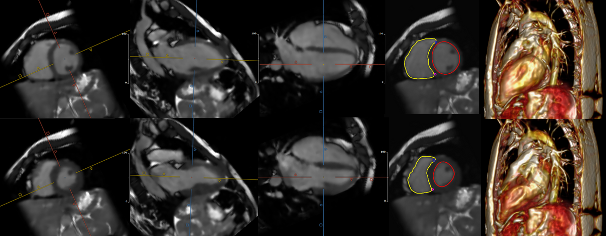 | Cine scan type (reformatted in-plane resolution) | LVEF +- Std Dev [%] | LVEDV [ml] | RVEF [%] | RVEDV [ml] |